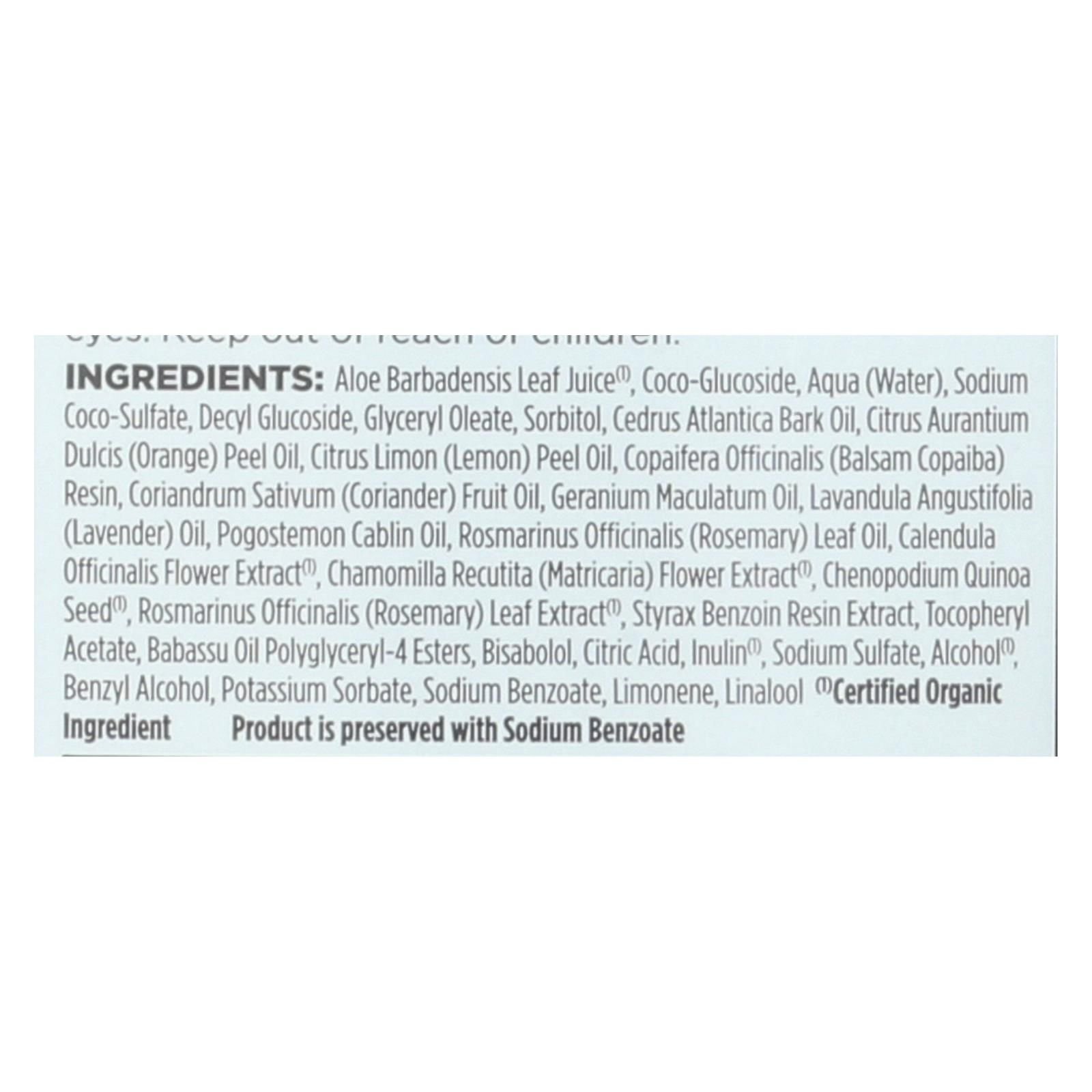 ingredients : aloe barbadensis leaf juice;¹;coco-glucoside;aqua;water;sodium coco-sulfate;decyl glucoside;glyceryl oleate;sorbitol;cedrus atlantica bark oil;citrus aurantium dulcis;orange;peel oil;citrus limon;lemon;copaifera officinalis;balsam copaiba;resin;coriandrum sativum;coriander;fruit oil;geranium maculatum oil;lavandula angustifolia;lavender;oil;pogostemon cablin oil;rosmarinus officinalis;rosemary;leaf oil;calendula officinalis flower extract;chamomilla recutita;matricaria;flower extract;chenopodium
