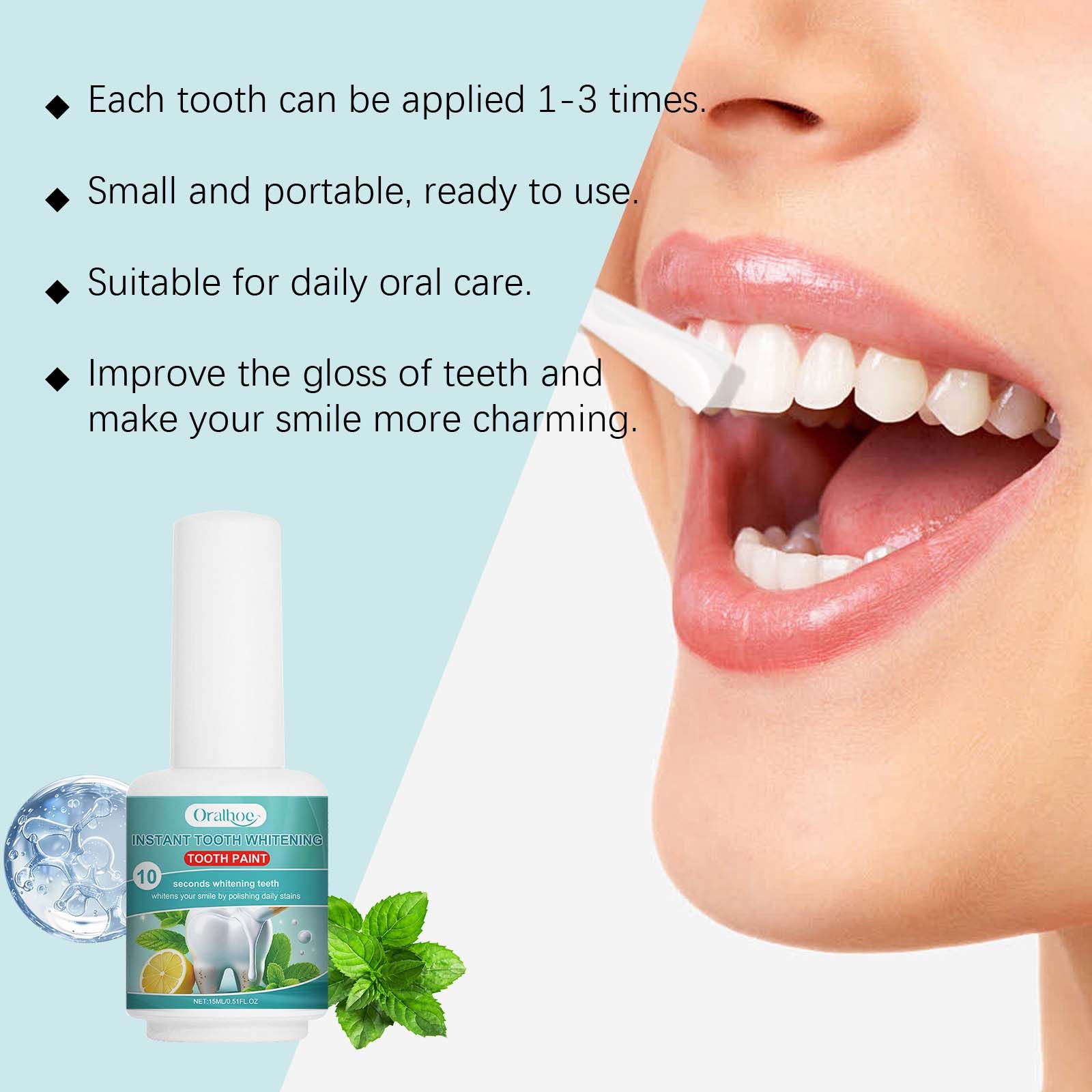 Our tooth cleaning t contains vitamin C, Alcamel thorn leaf extract, peppermint oil. It can effectively the teeth shine, show confidence smile. Nourish and strengthen teeth and build a protective layer. How to use it is simple: 1. First, make sure your teeth are clean and dry. 2. Apply the product lightly and thinly to each tooth. Cover evenly and avoid streaks. 3. Apply 1-3 times to each tooth, at least 10 seconds between each coat, to allow the tooth to dry. Long-term use to ation. Simple application, quick effect.