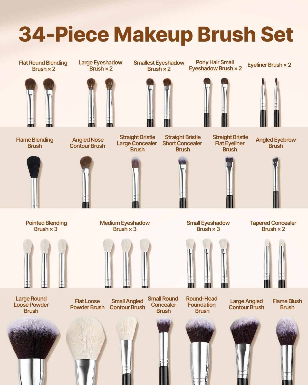 1.Deluxe Makeup Brush Set: This VEVOR 34-piece makeup brush set includes a wide variety of brushes in different shapes and sizes-foundation brush, powder brush, contour brush, concealer brush, eyeliner brush, blending brush, eyeshadow brush and more-to help you create a flawless and radiant look. A top choice for professional makeup artists